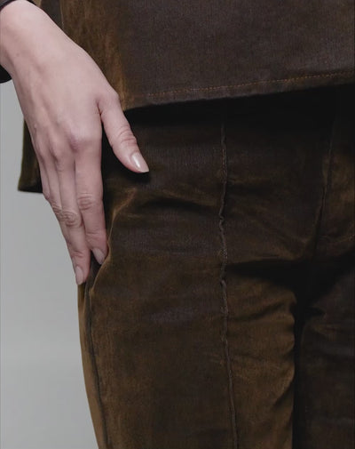 Jean flare tiro alto efecto gamuza café mujer